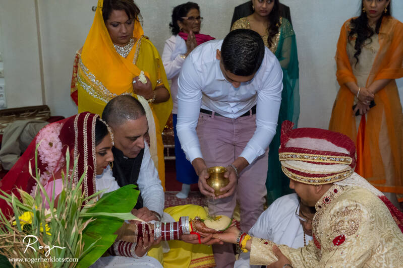 Hier wordt mijn nicht en haar man begeleid met rondjes lopen om het heilige boek. Dit wordt alleen gedaan door de mannelijke familieleden van mijn nicht, de bruid.