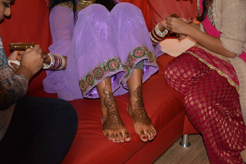 In de avond werdt er henna gezet voor de bruid door mijn moeder. Henna is meestal een soort bruin gekleurd iets. Als het erop is gezet moet je altijd best wel lang wachten totdat het gedroogd is. Als het is gedroogd kun je de hard geworden henna ervan afschrapen. Dan is het een soort oranje gekleurde tatoe.