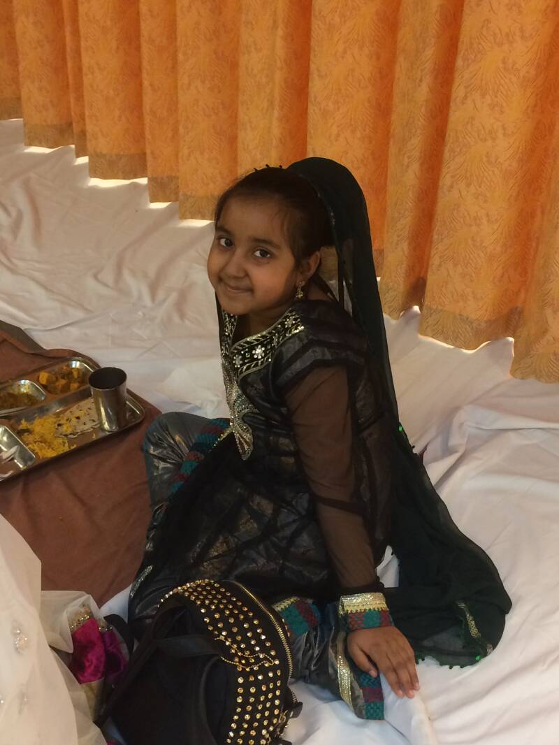 Ik in mijn Indiase kleding. Na de ceremonie was het tijd om te eten. het was indiaas eten wat ik helemaal geweldig vind ------>