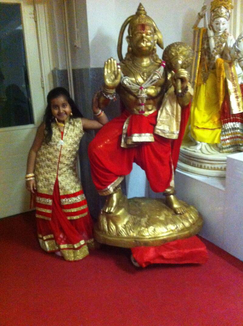 Ik die om de een of andere reden heel raar sta in mijn Indiase kleding in de tempel. Ik sta naast de god Hanuman ------>