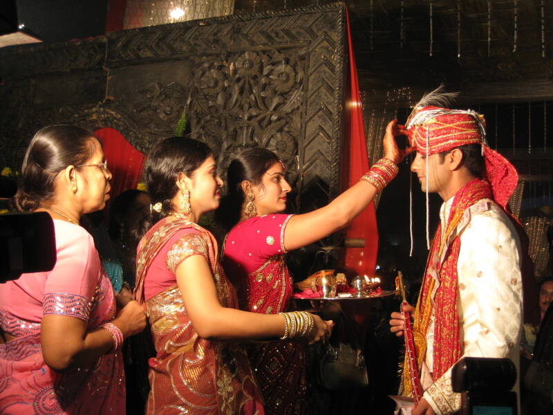 Daarna wordt de bruidegom verwelkomd door de moeder van de bruid en andere vrouwen. Dit gebeurt met een diya (theelichtje, oliepitje).