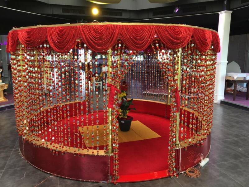 Hierna kunnen de bruid en bruidegom plaatsnemen in de Maroh. Dit is een huwelijksbaldakijn. Hier vindt de huwelijksceremonie plaats die een pandit (priester) doet.